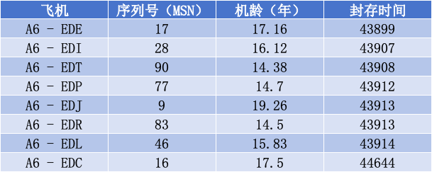 在考虑新A380之前,阿联酋航空自然会考虑重新启用其仍封存的少数几架A380。根据ch - aviation的数据,阿联酋航空仍有8架A380封存时间超过一年,这些飞机序列号(MSN)从9号(机龄19.25年)到90号(机龄14.38年)不等,具体情况如下: