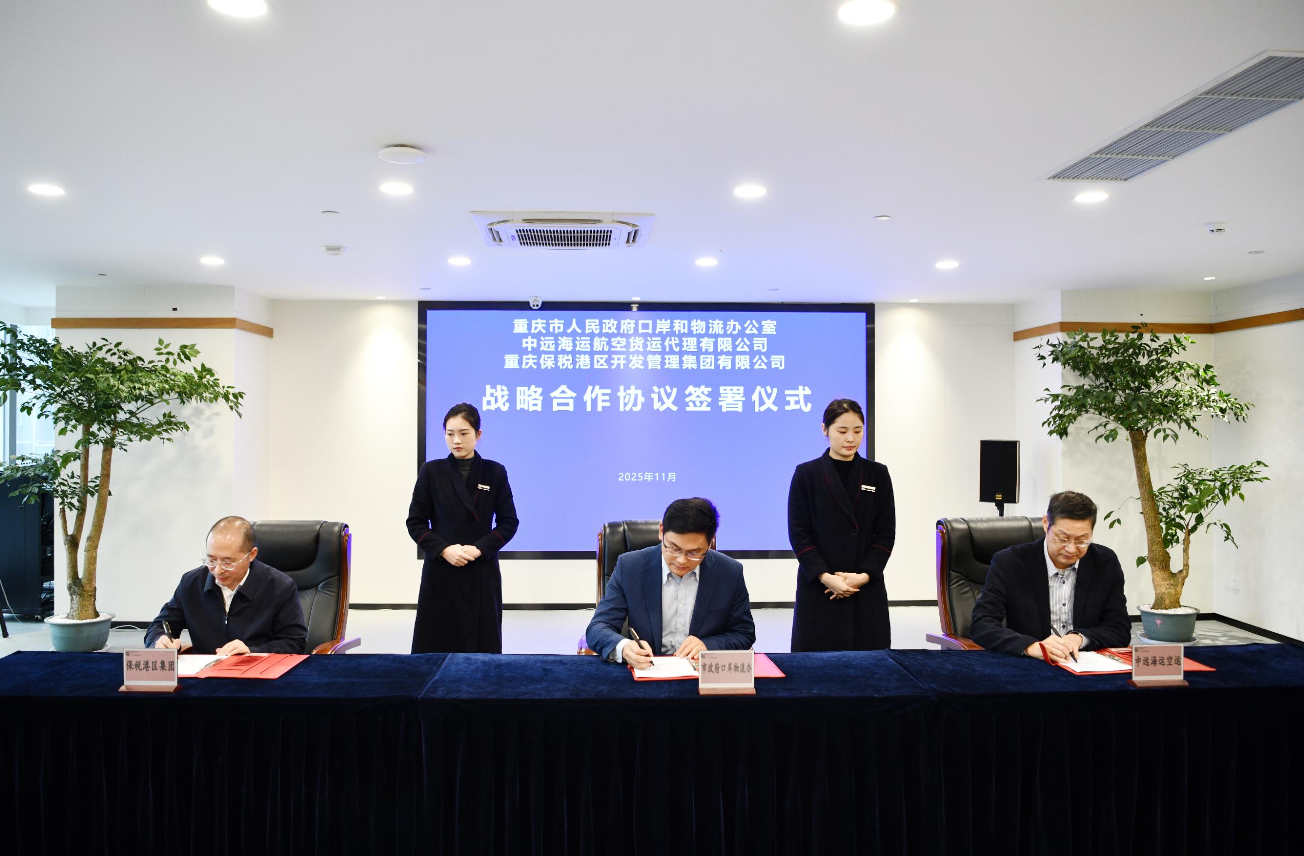 2025年11月25日上午,重庆市人民政府口岸和物流办公室、中远海运航空货运代理有限公司、重庆保税港区开发管理集团有限公司在重庆保税港区“一带一路”商务中心举行战略合作协议签署活动。