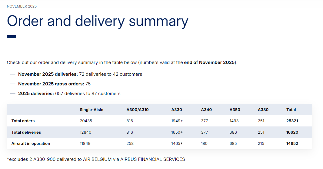 2025年11月空客交付详情