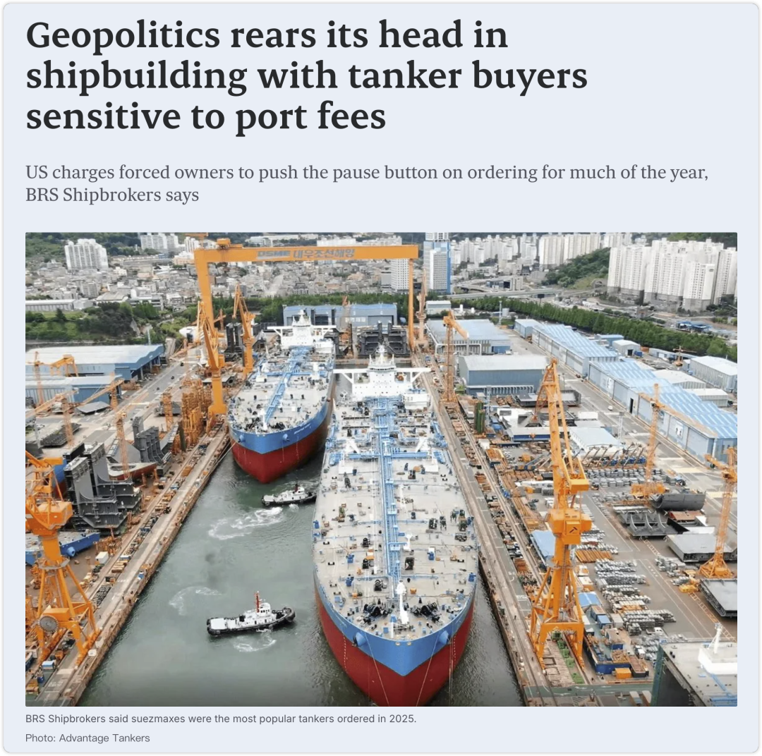 看似矛盾的一个现象是:政策风波下,中国船厂承接的VLCC订单占比仍超70%。这恰恰说明,船东把“产地风险”分层对冲了:对美线暴露度低、主要服务中东—亚洲/巴西—亚洲的VLCC,仍然用价格和交期说话;对跨大西洋成品油、美国原油出口链路的船队,更多考虑韩、日船厂,或者干脆等一等。这不是“弃中选韩/日”,而是“分舱布局”。而且,对于中资背景买家或绑定中资长约的项目,政策风险的可转移性更强,选择中国船厂是合乎商业逻辑的。