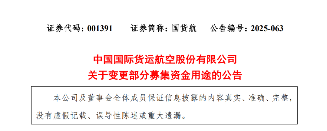 航空旅(FlightGlobal)消息,中国国际货运航空股份有限公司(证券简称:国货航,证券代码:001391)12月25日发布公告称,公司第二届董事会第七次会议于12月24日审议通过《关于变更募集资金用途的议案》,拟终止“综合物流能力提升建设”项目,并将原计划投入该项目的2.83亿元募集资金(占首次公开发行股票募集资金净额的8.22%)全部转向“飞机引进项目”。该事项不涉及关联交易,后续需提交公司股东会审议。