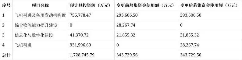 国货航于2024年完成首次公开发行股票,超额配售选择权行使后,公司共计发行15.19亿股普通股,募集资金净额总计34.37亿元。根据招股说明书及后续调整,原计划将募集资金投向三大项目:飞机引进及备用发动机购置(29.36亿元)、综合物流能力提升建设(2.83亿元)、信息化与数字化建设(2.19亿元)。