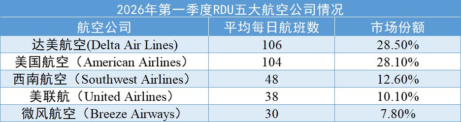 自那以后,两家航空公司在RDU展开了白热化的竞争,市场份额差距微乎其微。近期,美国航空在市场份额上略占上风,2024年全年市场份额领先不到1%。但根据Cirium 2026年第一季度的数据,达美航空成功重夺RDU第一大航空公司的宝座: