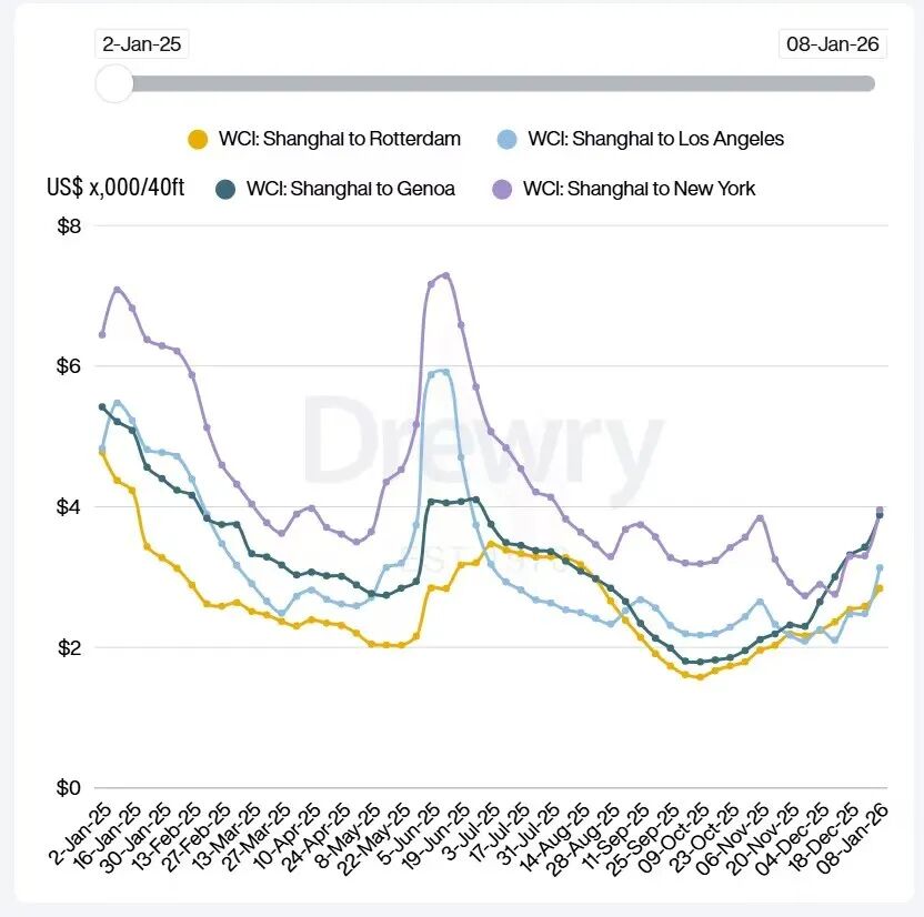 若需求持续坚挺,下周运价可能进一步上涨。地中海航运已宣布自1月15日起,将亚洲-北欧航线FAK费率上调至每40英尺箱4000美元,亚洲-地中海航线则调至5500–5700美元。跨太平洋市场同样表现活跃,上海-洛杉矶航线运价较12月25日上涨26%,至3132美元,上海-纽约线上涨20%,至3957美元。