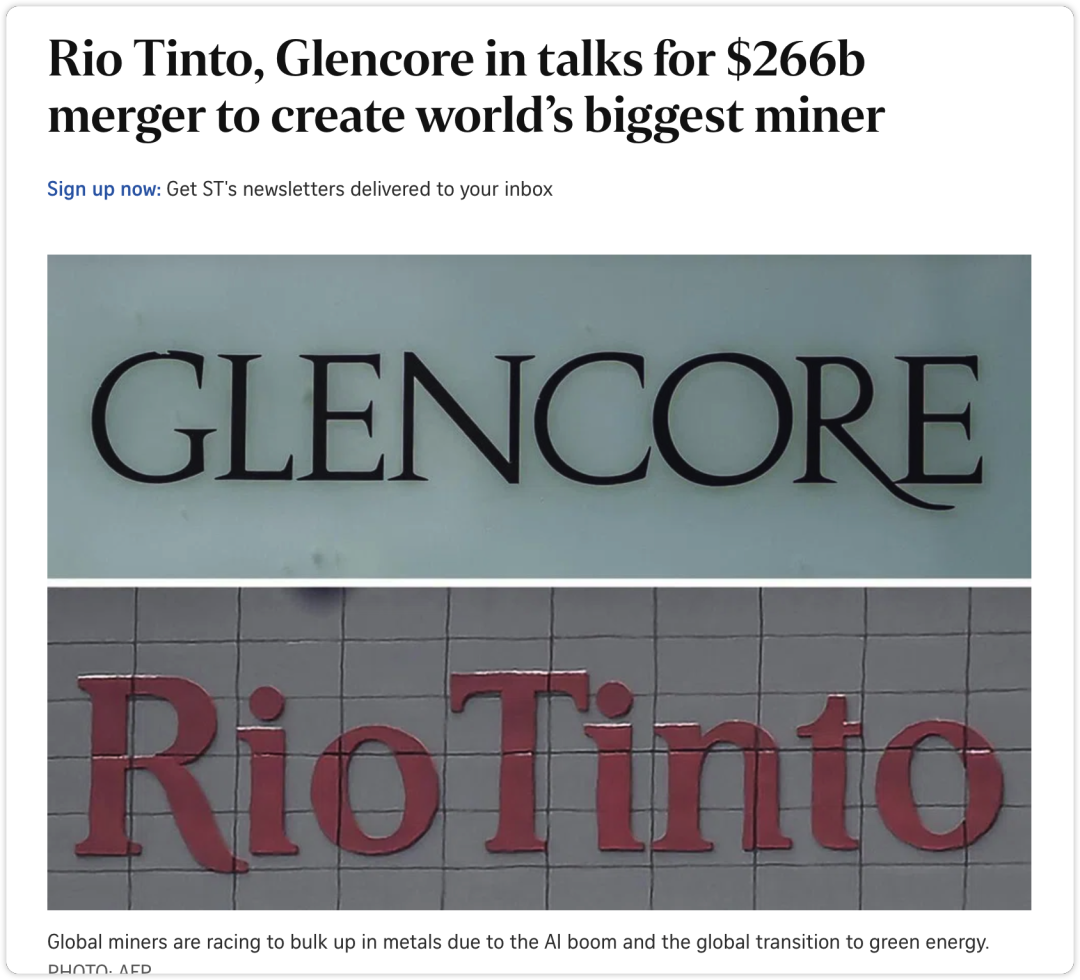 此次谈判并非首次,双方曾进行类似接触,但无果而终。如今,全球最大上市煤炭生产商Glencore近年持续加码铜矿投资,再度携手已于 2018 年全面退出煤炭业务、兼具英澳背景的铁矿石、铝土矿和铜矿巨头Rio Tinto。Rio Tinto在声明中明确表示:“双方正在就部分或全部业务的合并进行初步讨论,其中可能包括全股合并。”更关键的是,其指出“当前预期任何合并交易将以Rio Tinto收购Glencore的方式实现”。