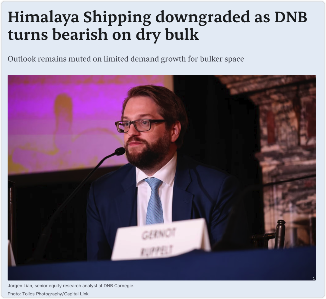 挪威投行DNB Carnegie在最新干散货行业报告中,将喜马拉雅航运(Himalaya Shipping)评级下调至“卖出”,同时整个散货板块无一公司获“买入”推荐。分析师Jørgen Lian对干散货需求前景持谨慎态度,目前对四家散货上市公司维持“持有”评级。