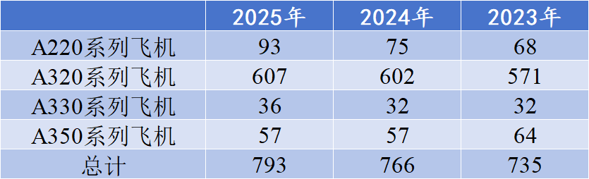 其中,A220系列有49架订单,这款机型以其出色的燃油经济性和灵活的运营能力,正逐渐在全球市场中崭露头角;A320系列作为空客的明星产品,获得了656架订单,再次证明了其在单通道飞机市场的主导地位;A330neo有100架订单,展现了其在宽体机中短程市场的强大竞争力;A330 MRTT有2架订单,凸显了空客在军事航空领域的拓展;A350系列则收获了193架订单,这款远程宽体客机以其先进的技术和卓越的舒适性,赢得了众多航空公司的青睐。