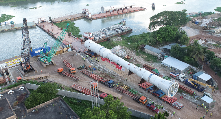 而在孟加拉国,中远海运同样创下运输奇迹。承运中化七孟加拉 能源项目时,团队攻克水位多变、资源匮乏、施工审批复杂等难题,创新采用双码头形式与专项动力配置,整合多类型运输设备并精准拆拼。技术团队手把手指导当地操作人员,遇水位未达预期便紧急加挂浮筒,成功将489吨、69米长的CO₂汽提塔安全送达,刷新该国最长、最重件运输纪录。