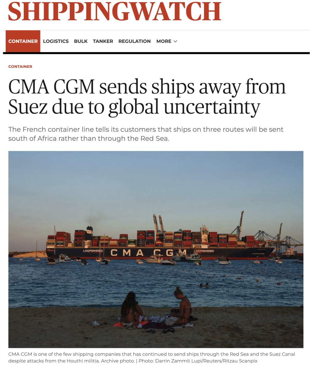 1. CMA CGM因全球不确定性避开苏伊士运河,三条航线改道非洲南部