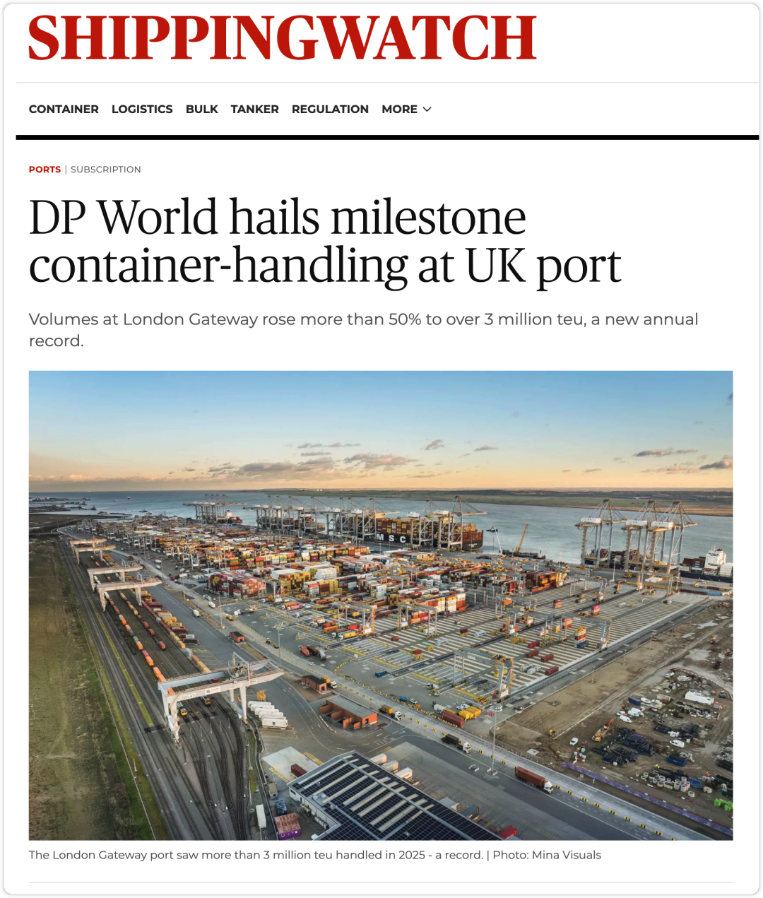 迪拜港口运营商DP World宣布,其旗下英国伦敦门户港(London Gateway)2025年集装箱吞吐量突破300万TEU,较2024年的190万TEU增长约52%,创年度新纪录。