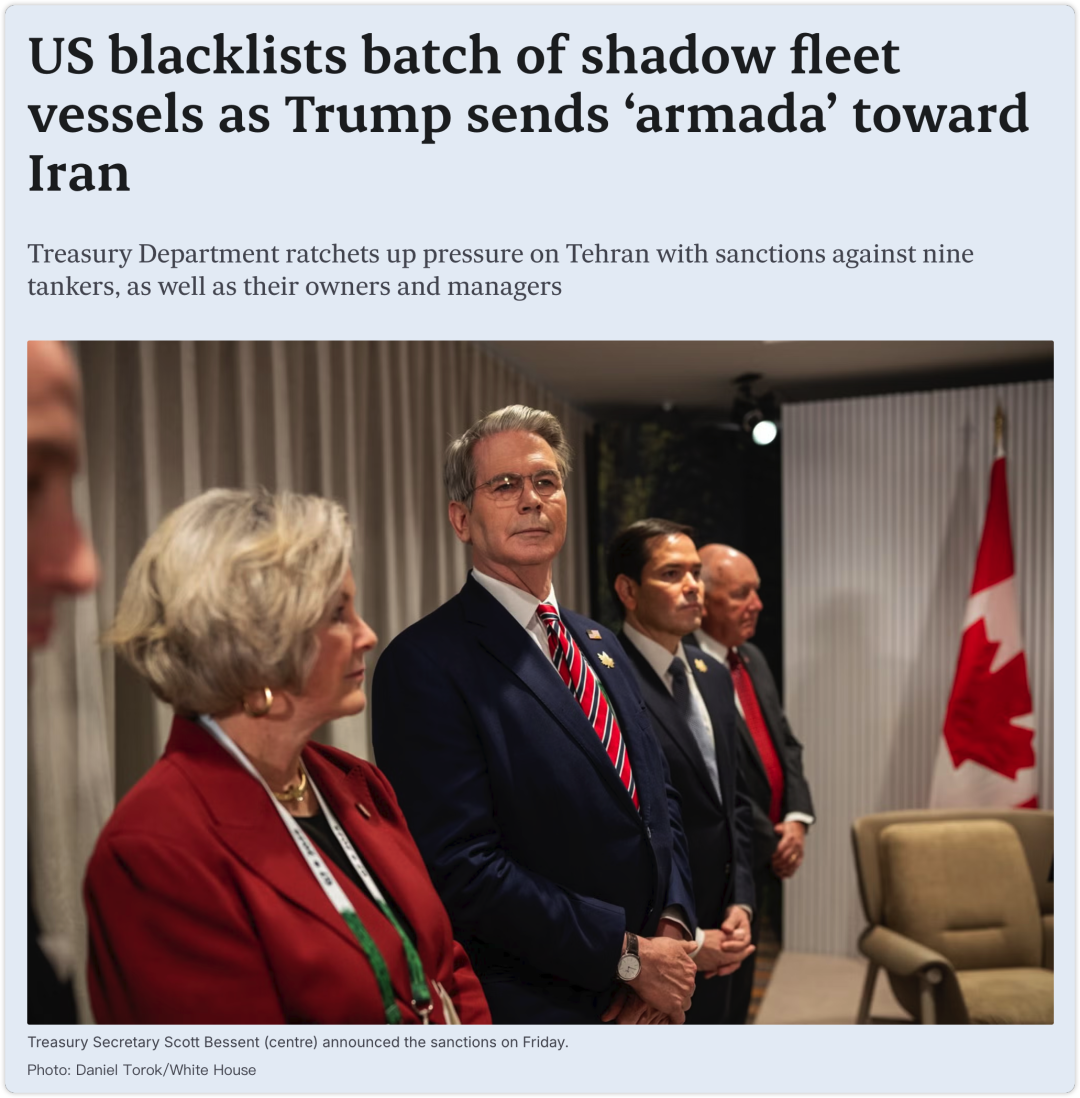 据外媒报道,美国财政部近日宣布对9艘涉嫌为伊朗运输石油及相关产品的“影子舰队”油轮及其所有者和管理者实施制裁,与此同时,特朗普总统公开表示正向中东派遣一支规模庞大的海军力量,被他称为“舰队”“大规模舰队”乃至“无敌舰队”(armada)。这一系列动作进一步加剧了对伊朗政权的压力,背景是伊朗当局对国内大规模抗议活动的残酷镇压。