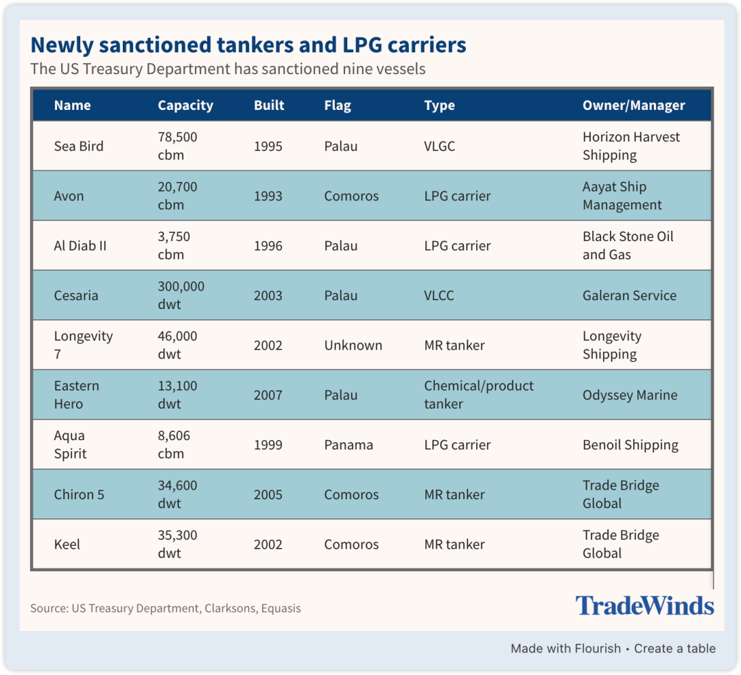 此次被制裁的9艘船只中包括4艘LPG运输船,其中规模最大的是7.85万立方米超大型气体运输船(VLGC)Sea Bird(1995年建造)。该船的管理公司为注册在阿联酋的Horizon Harvest Shipping(联系信息暂不可得),同样被列入制裁名单。美国官员指控这艘VLGC曾向东亚、吉布提和阿联酋运送数十万桶伊朗LPG。