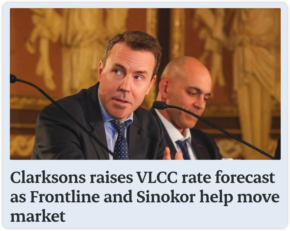 近日,克拉克森证券提高了其对 2026 年 VLCC 即期运价的预测,预计市场将趋紧。事实上,当Frontline把7艘VLCC以单船日租7.69万美元锁出去,价格已经替我们做了判断