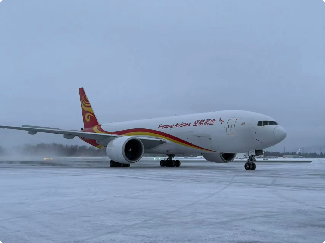 此次航班由B777F执飞,每周一班定期运营(以实际运营为准),主要承运挪威三文鱼、北极虾等高附加值海鲜产品。此次投运的B777F全货机最大业载可达103吨,在满载状态下能够飞行9200公里,它能够大幅缩短货物的运输时间,仅需约9.5小时即可从奥斯陆抵达上海,对时效性要求极高的生鲜产品提供了“从海洋到餐桌”的运输选择。