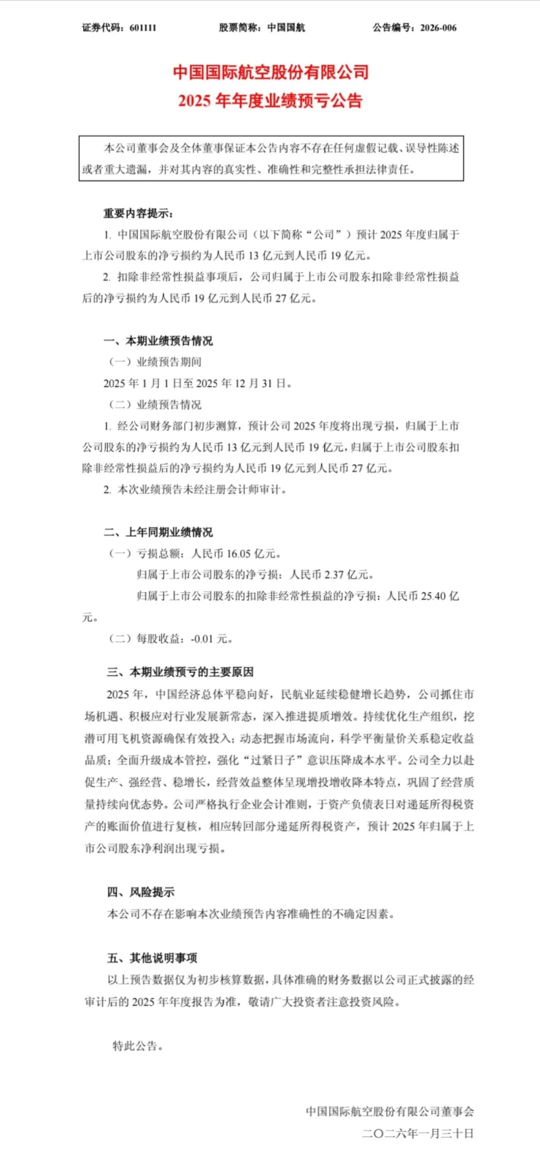 中国国航预计2025年度归属于上市公司股东的净亏损约为人民币13亿元到19亿元,扣除非经常性损益事项后,净亏损更是高达19亿元到27亿元。回顾2024年,国航亏损总额为16.05亿元,归属于上市公司股东的净亏损2.37亿元,扣除非经常性损益的净亏损25.40亿元。