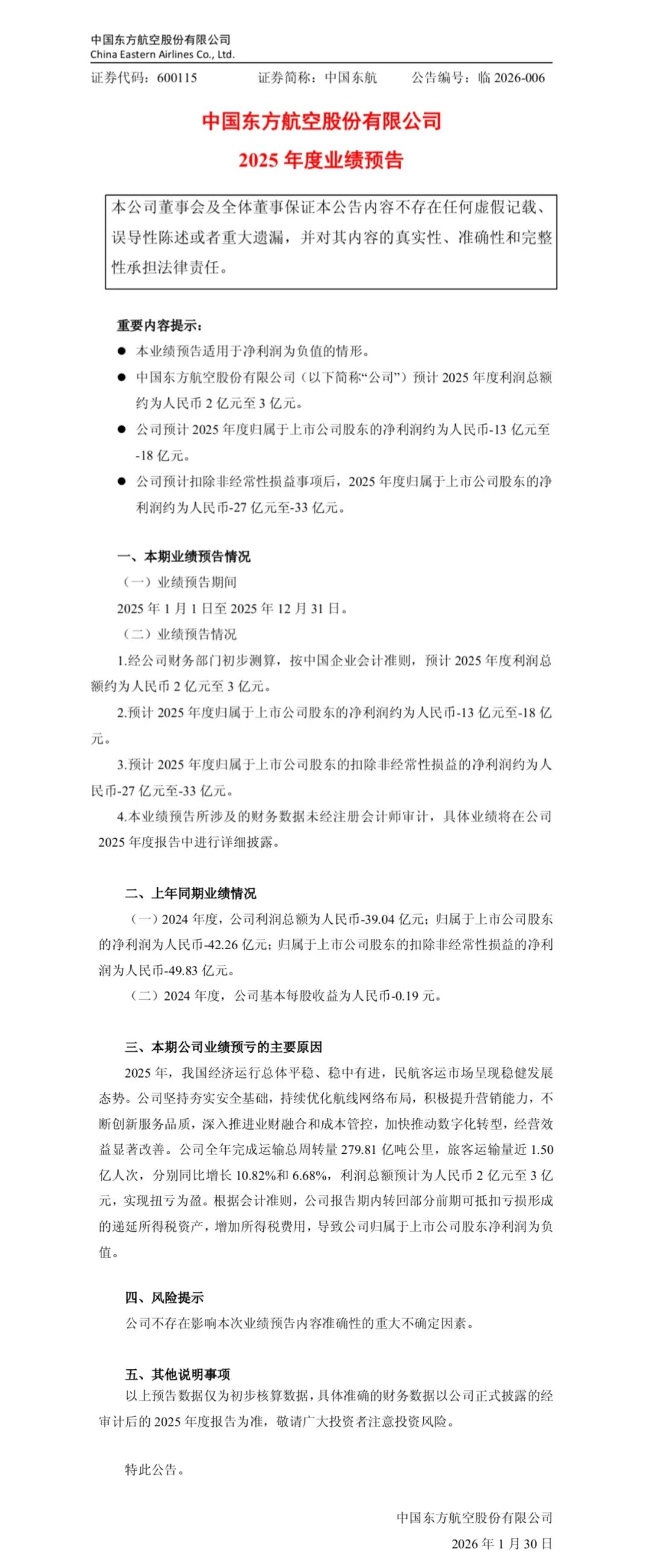 中国东航的情况同样不容乐观。2025年度预计利润总额约为人民币2亿元至3亿元,看似有扭亏为盈的迹象,但归属于上市公司股东的净利润却预计为人民币 -13亿元至 -18亿元,扣除非经常性损益事项后,更是达到 -27亿元至 -33亿元。与2024年利润总额 -39.04亿元、归属于上市公司股东的净利润 -42.26亿元、扣除非经常性损益的净利润 -49.83亿元的惨淡业绩相比,虽有改善,但仍未摆脱亏损的阴影。