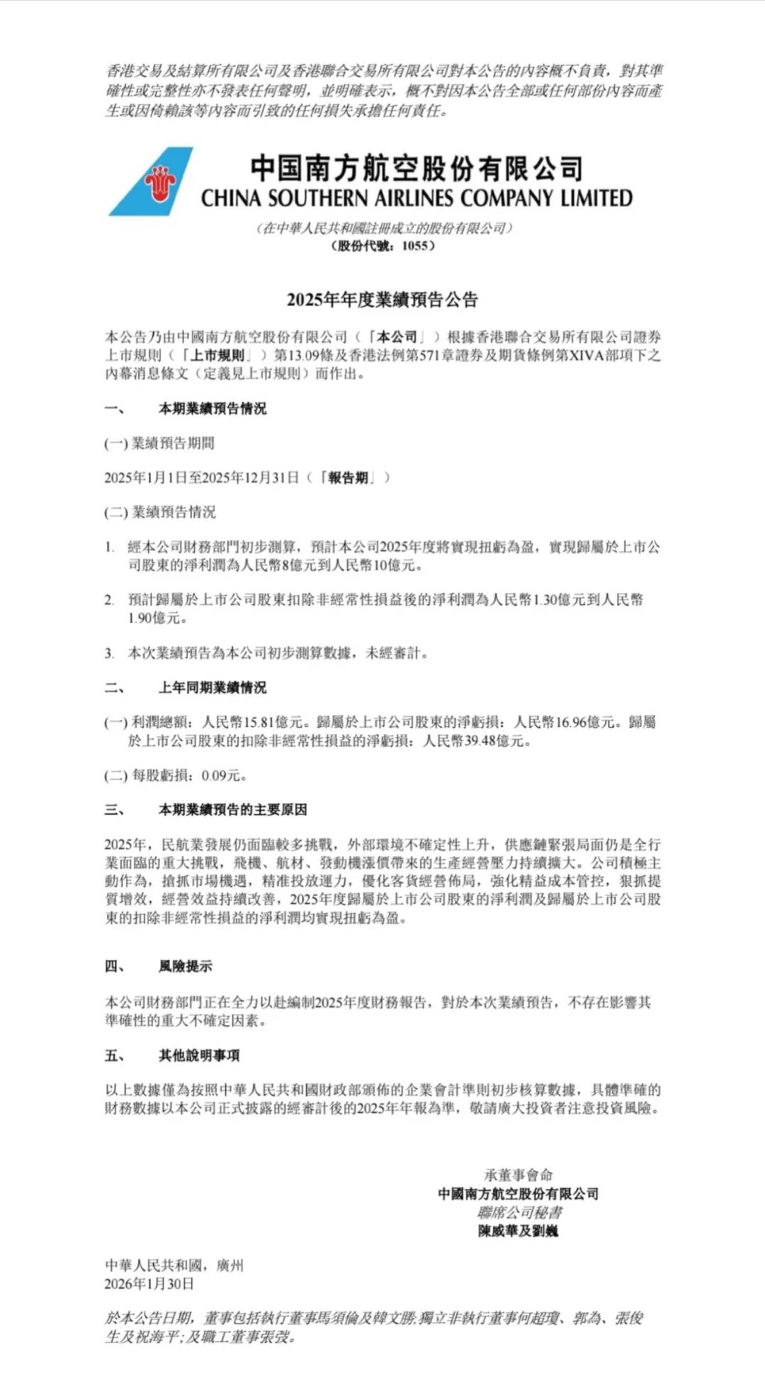 航空旅(FlightGlobal)消息,1月30日下午,国内三大航发布2025年度业绩预告。中国国航、中国东航深陷亏损困境,而南方航空却成功扭亏为盈,几家欢喜几家愁的局面跃然纸上。