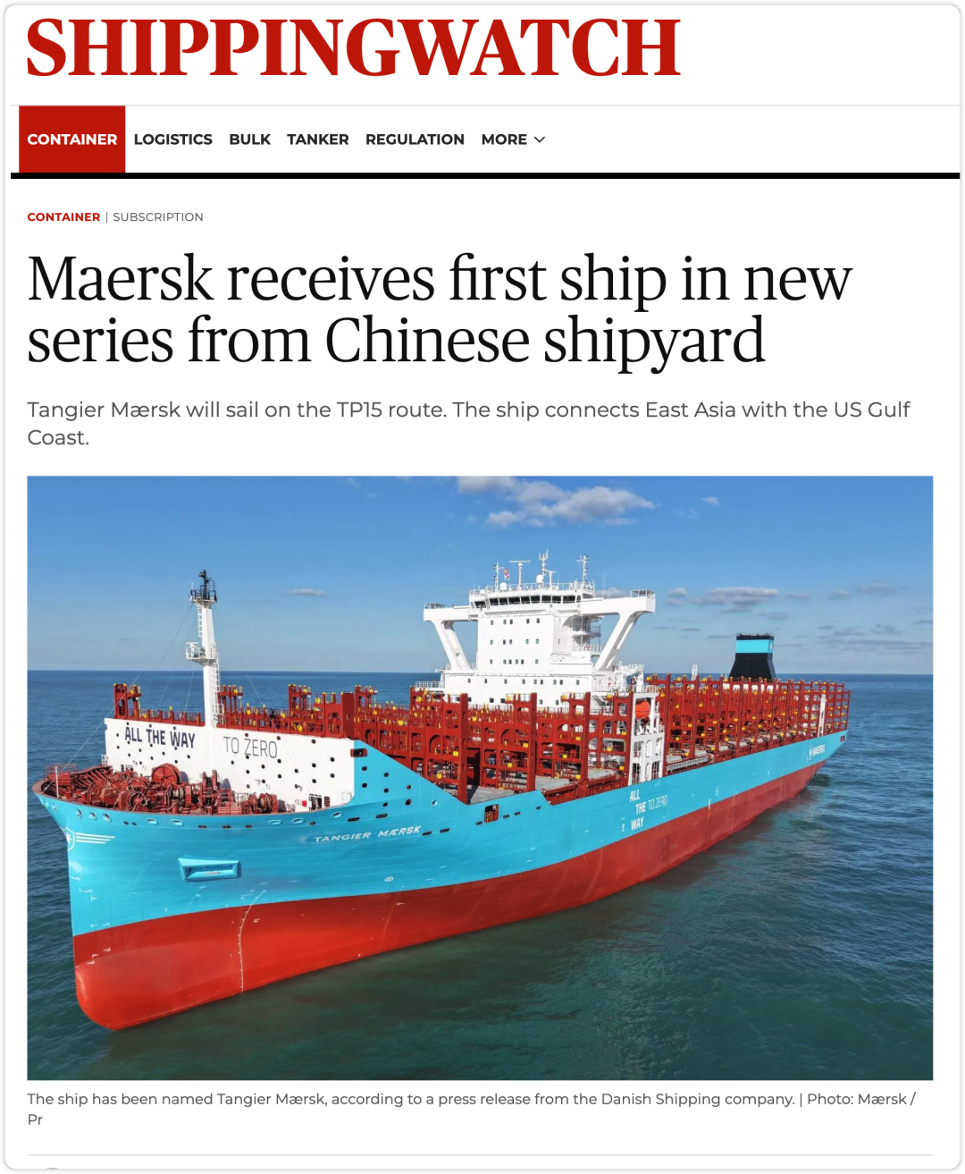A.P. Moller-Maersk从扬子江船建集团靖江船厂接收9000TEU双燃料(含甲醇)新系列首船,并命名为Tangier Mærsk。该系列共6艘,首船提前3个月交付,将首航马士基TP15泛太平洋航线(经巴拿马运河)。