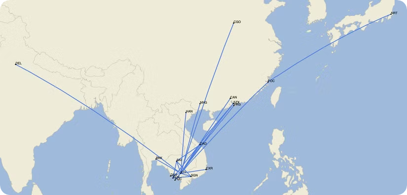 从柬埔寨出发,柬埔寨航空飞往17个目的地的航班频率各有不同。执飞航班数量最多的目的地是越南胡志明市(SGN),共187个航班,相当于每日往返6.7次。与此同时,本月飞往中国南宁的定期航班仅有7个,相当于每个方向提供1050个座位。