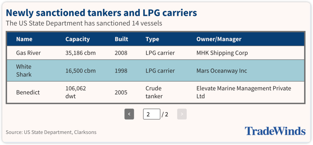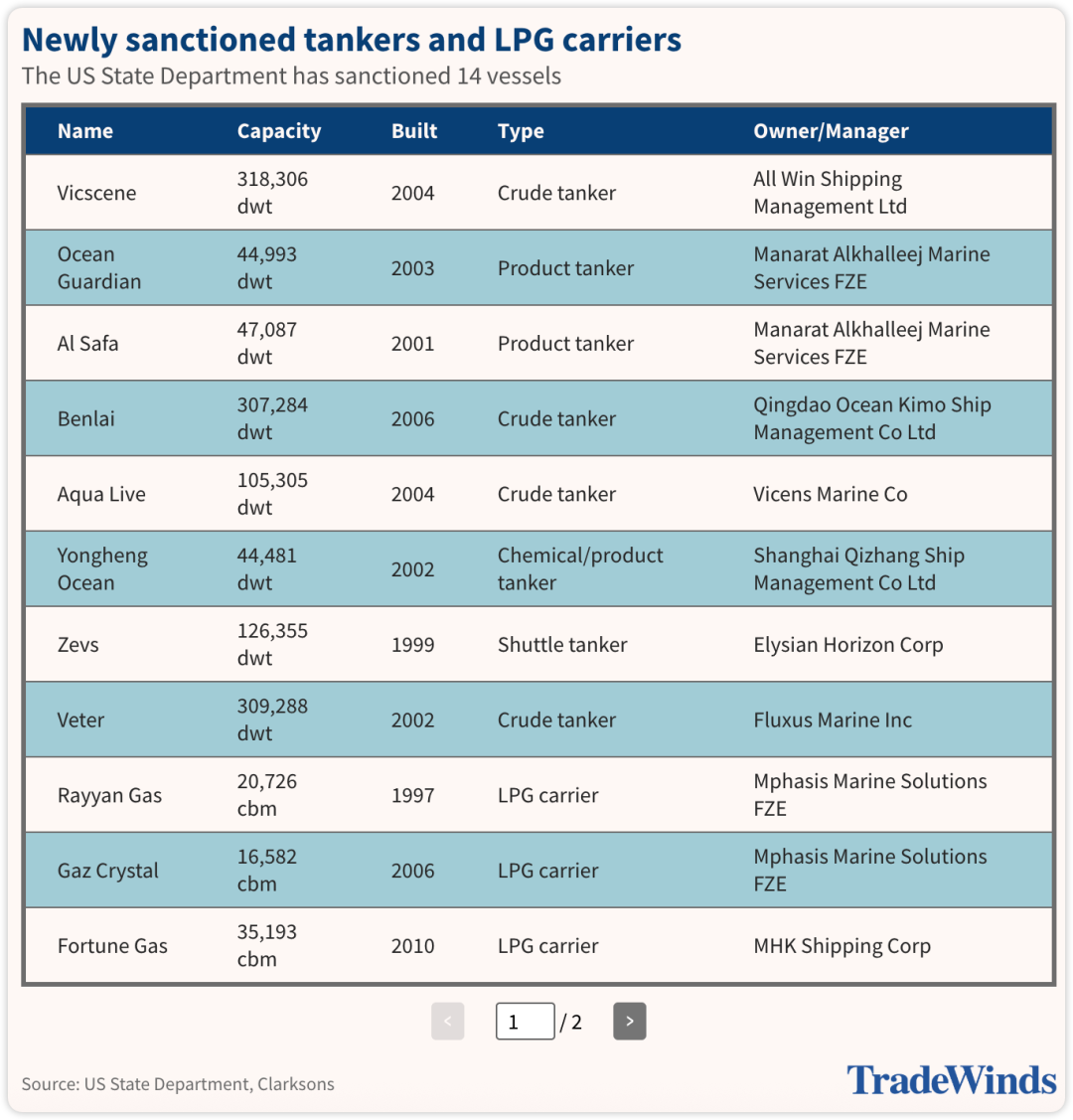 此次制裁涉及9艘油轮和5艘液化石油气(LPG)运输船,美国国务院称这些船只属于伊朗的“影子舰队”,长期用于规避制裁、运输伊朗原油、成品油以及氨产品。其中油轮包括5艘原油运输船(含1艘穿梭油轮和3艘超大型原油运输船VLCC)以及3艘成品油轮;LPG运输船的运力则在16,500立方米至35,200立方米不等。