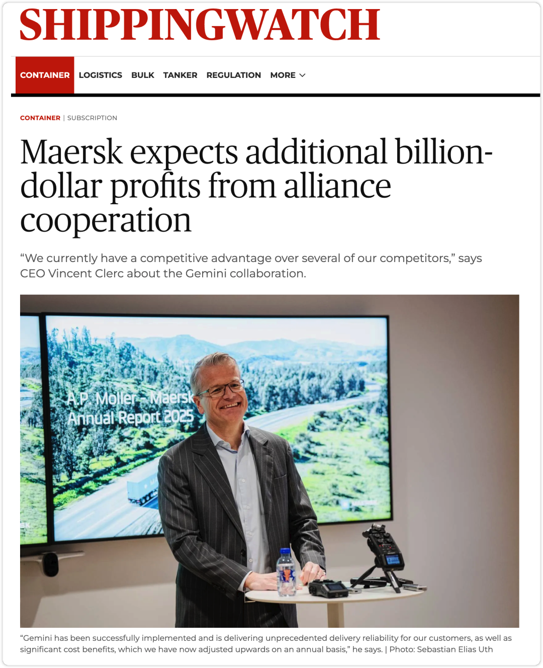 这三板斧砍得干净利落,直接把Gemini从“过渡性联盟”变成了马士基在过剩市场里的核心竞争壁垒。Clerc直言:“Gemini目前仅覆盖我们网络的约一半,我们仍看到将这些优势扩展到其他业务的潜力。”言外之意很清楚:马士基还没出全力。