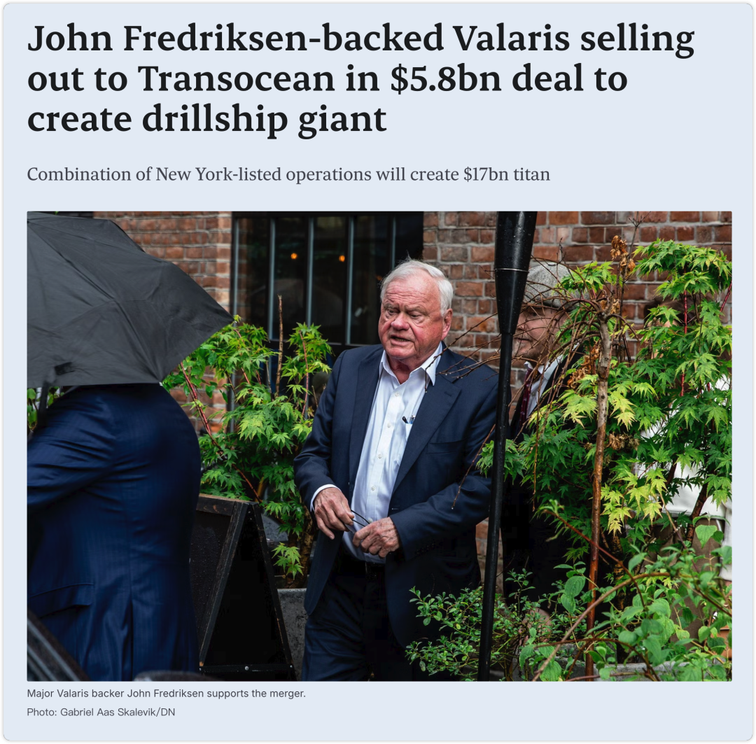 双方预计交易可实现超过2亿美元的已识别成本协同效应,同时市场对合并后公司市值估值为123亿美元。Mohn旗下的Perestroika持有Transocean约9%的股份,而弗雷德里克森的Famatown Finance与Oak Hill Advisors共同控制Valaris约18%的股份,两位主要股东均已明确支持此次合并。