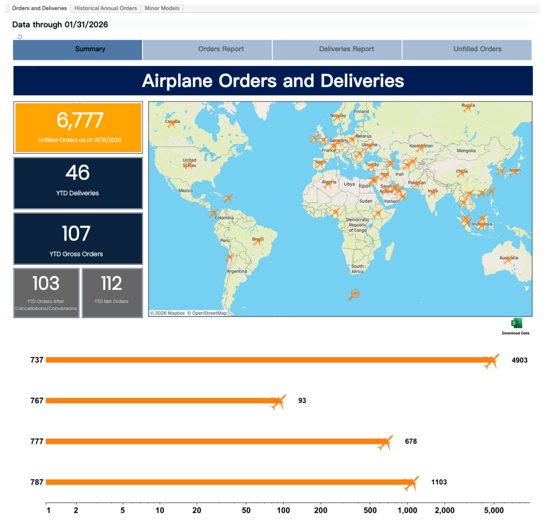 此前,波音经历了数年的制造放缓以及严格的监管审查,如今正逐步从困境中反弹。尽管空客目前仍拥有更大的长期积压订单量,但1月份的数据清晰地显示出,随着供应链逐渐稳定、认证关键节点愈发明确,飞机制造商的月度表现存在较大的变数。对于波音来说,年初的这些数据表明其在窄体和宽体飞机项目上正重新获得发展的动力。
