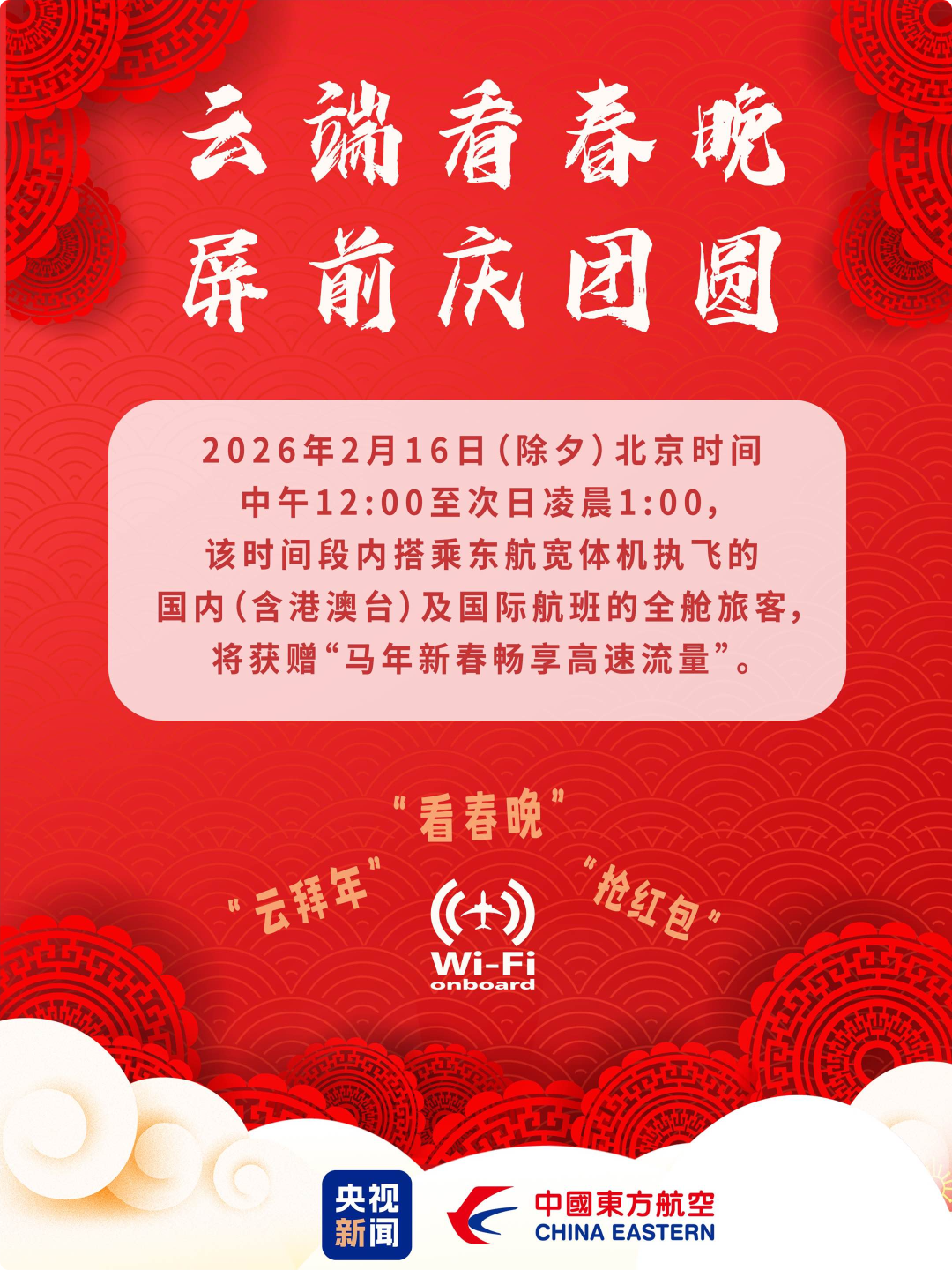 此次升级,东航特别推出三重升级的“云端观春晚”特色活动,进一步烘托春运与新春氛围。 一重升级,时间大幅延长:免费高速Wi-Fi服务时段从原计划的4个半小时,大幅拓展——自除夕12:00持续至次日01:00。 二重升级,航班全面覆盖:除夕当日,东航所有近200个宽体机执飞的航班,航线网络覆盖六大洲29个国家和地区、近5万名旅客,自12:00起即可使用免费Wi-Fi服务,体验云端团圆。 三重升级,互动更添年味:活动时段内,旅客不仅可收看央视春晚,还可与亲朋好友进行抢红包、发祝福等互动,让高空年味不减、喜庆随行。