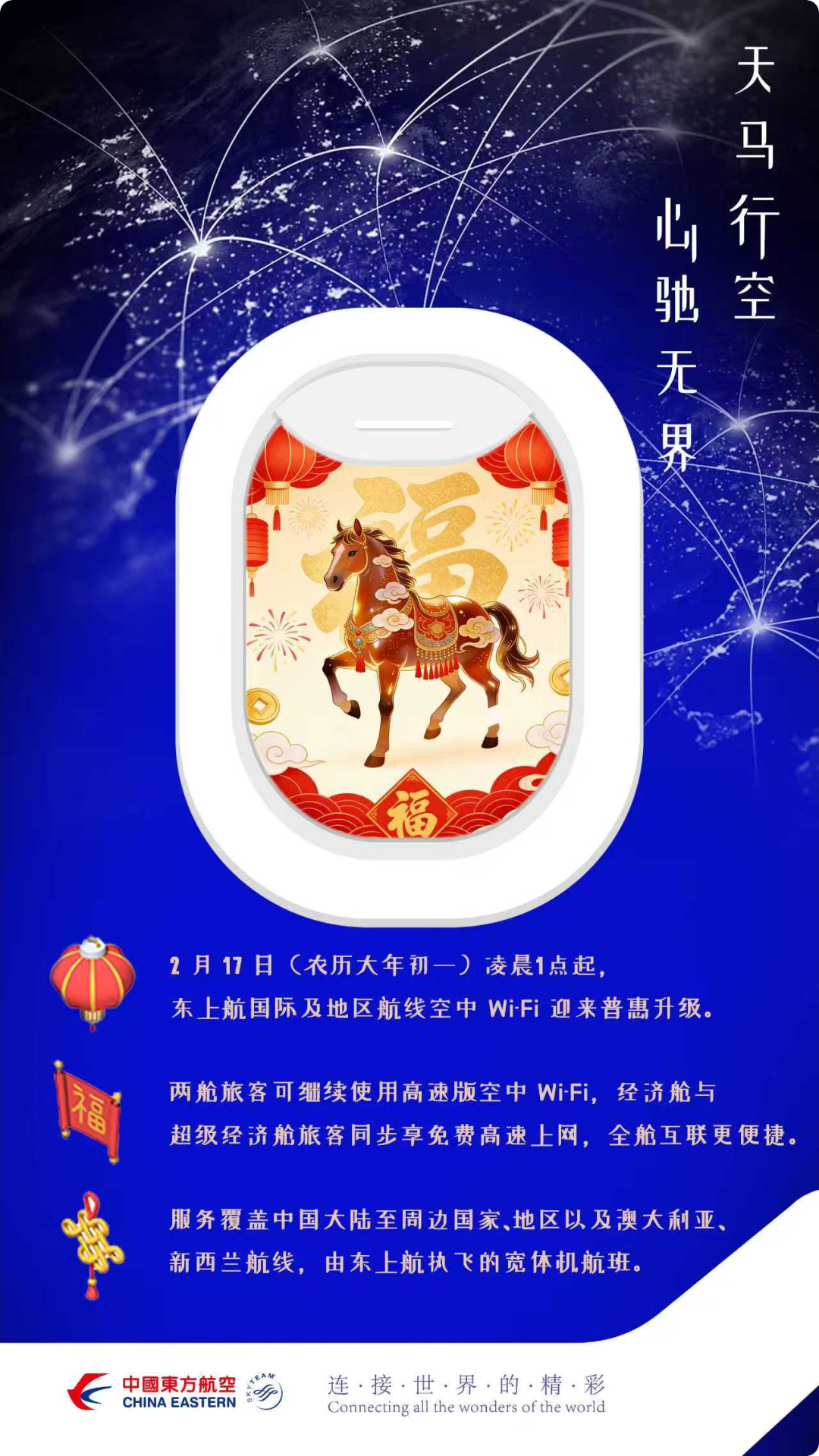 春运承载着千家万户的团圆期盼,春节是传递温情与祝福的美好时刻。此次东航空中Wi-Fi服务全面升级,正是这支民航“国家队”、“主力军”践行“人民航空为人民”宗旨、以数智化服务助力美好中国年。未来,东航将持续优化空地互联体验,推出更多暖心的客舱服务,与广大旅客一同奔赴平安、喜乐、联通无碍的新航程。
