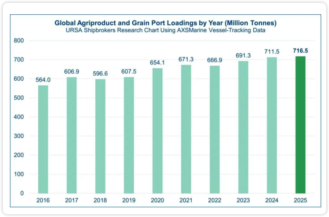 在全球主要农产品持续丰收与贸易回暖的带动下,干散货市场迎来新一轮增长动能。航运经纪机构 Ursa Shipbrokers 最新数据显示,2025年全球海运农产品贸易量创下历史新高,全年装运规模达到7.165亿吨,同比小幅增长1%。