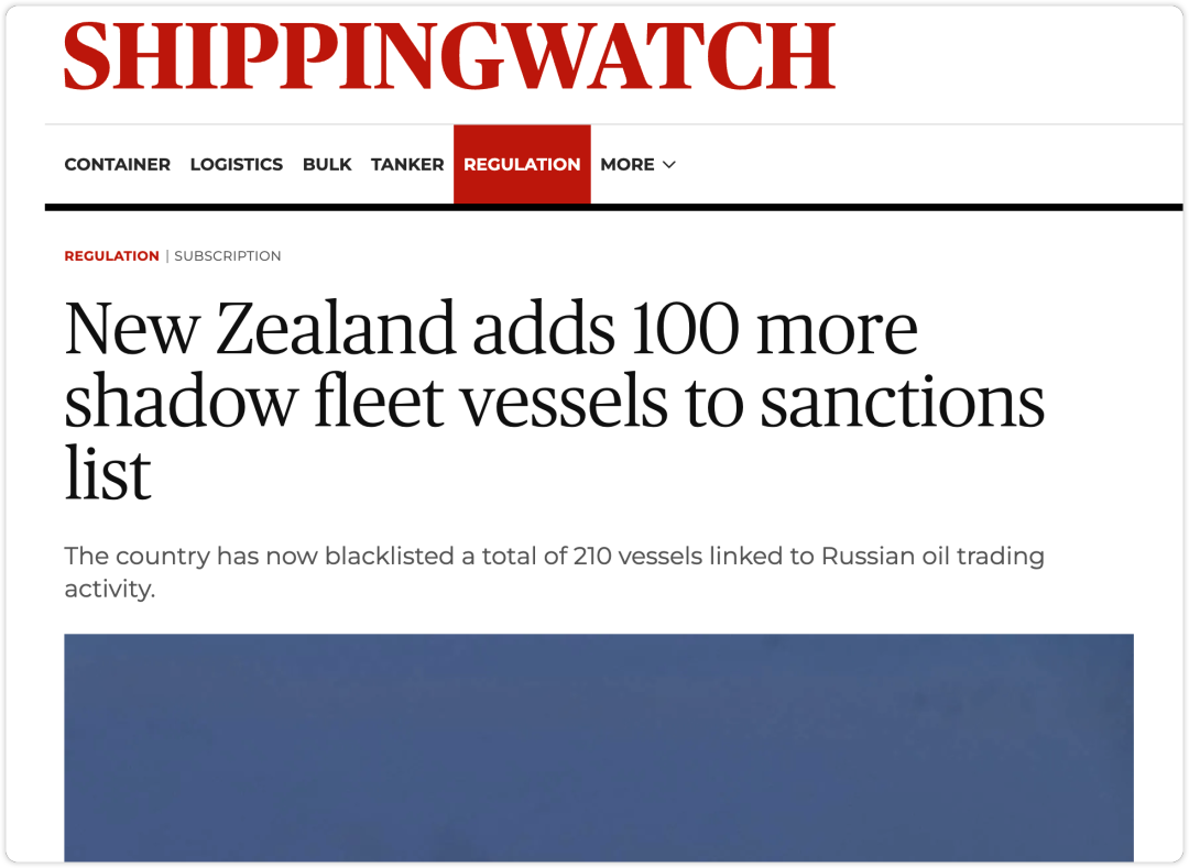 “影子船队”(shadow fleet)是指俄罗斯为规避西方制裁而组建的一支非透明油轮舰队。这些船舶通常通过频繁更换船旗、船东、保险和船员等方式,隐匿真实身份,继续运输俄罗斯受限石油至全球市场,为莫斯科的战争机器源源不断地提供资金。自2022年俄乌冲突以来,新西兰与欧盟、英国、美国等西方国家一道,不断升级对俄制裁力度,力求切断其经济命脉。