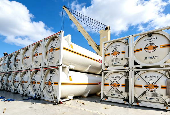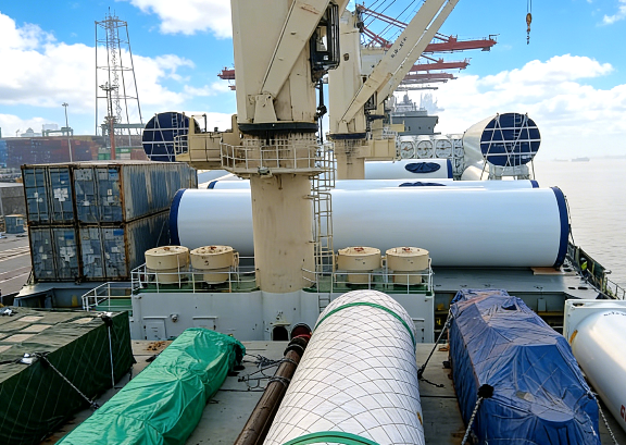 在设备集港期间,团队以集港现场需要为最高标准,克服恶劣天气,组织外租机械在塔筒当天进港、当天完成卸车和海运工装的安装,助力车队返程二次运输设备集港,保障了风电塔筒的顺利装船及出运。
