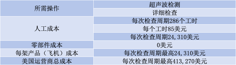 对于在美国注册的17架受影响飞机,FAA估计美国运营商的总合规成本将达到413,270美元,即每架飞机24,310美元。零部件成本极低,但每次检查周期需多达286个工时。详情如下: