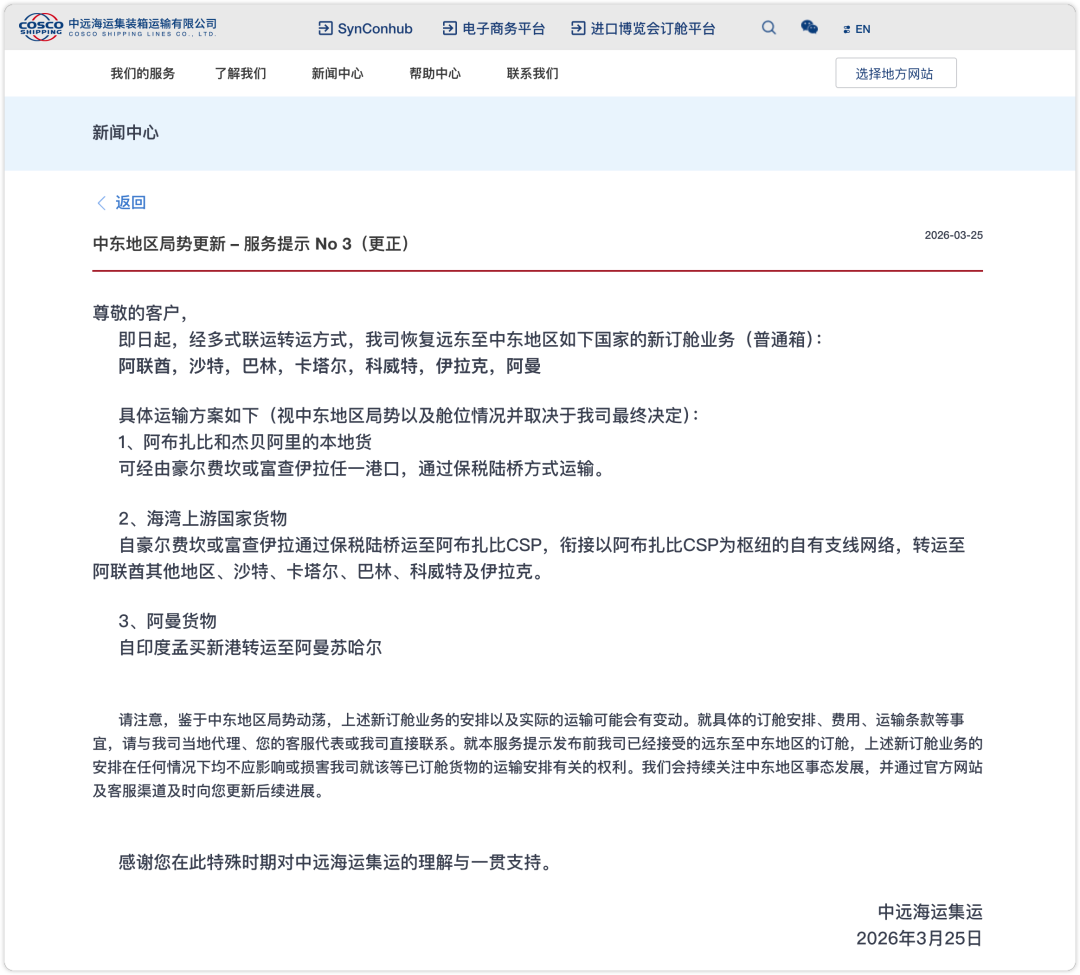2026年3月25日消息,中远海运集运宣布,恢复远东至阿联酋、沙特、巴林、卡塔尔、科威特、伊拉克的新订舱业务(普通箱)。但这并不意味着霍尔木兹海峡已经恢复正常通航。更不是船舶大队直冲波斯湾腹地的回归。