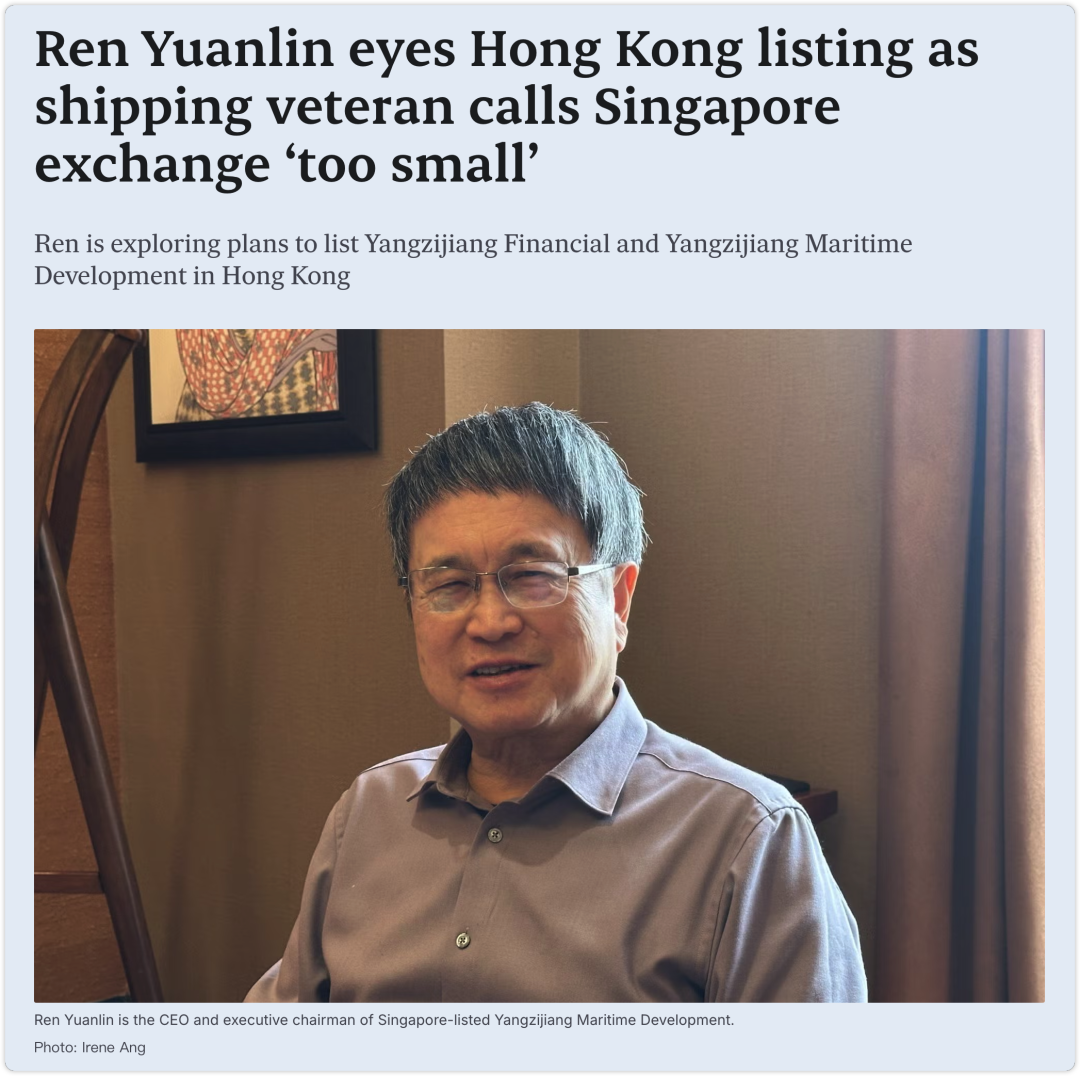 任元林直言不讳:“新加坡交易所太小了,而且已经陷入停滞。”他指出,扬子江海事发展和扬子江金融两家公司的估值未能得到市场合理体现。“我们正在考虑将扬子江金融和扬子江海事发展(或其中之一)在香港上市,可能采取双重上市方式,也可能从新加坡退市后转到香港。”不过,他同时强调,目前尚未作出最终决定。