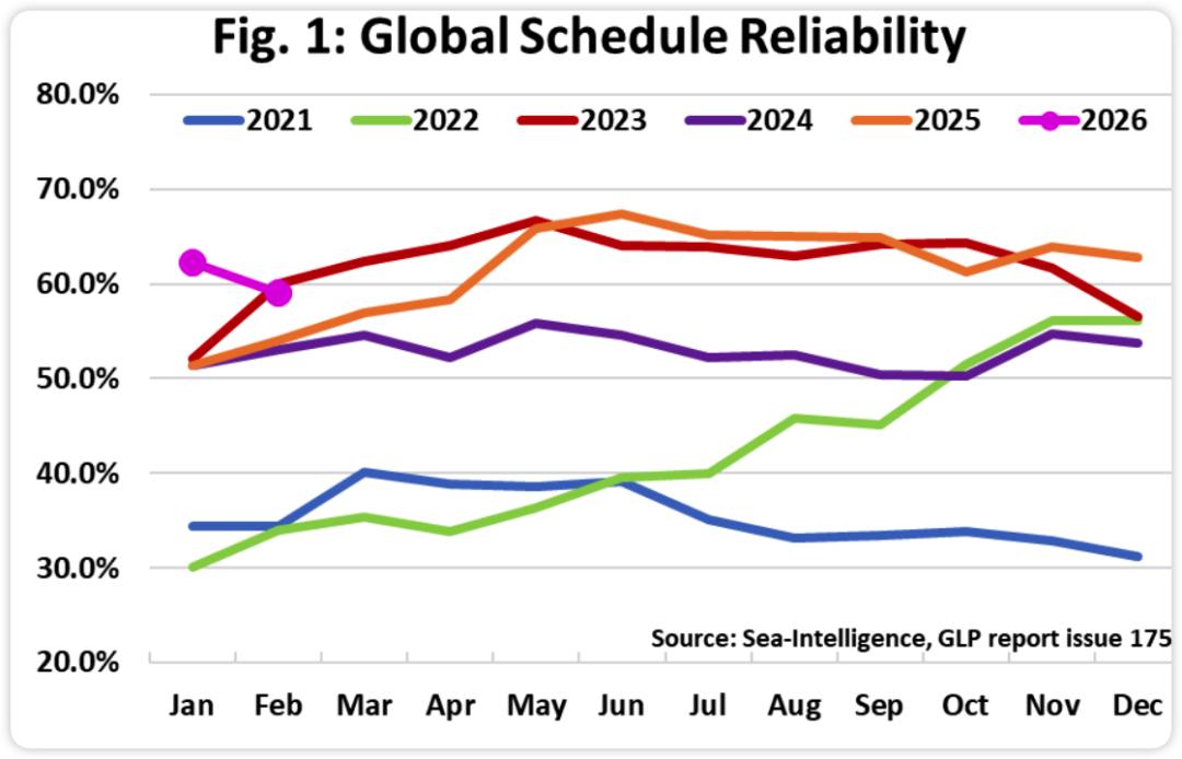 如果说运价是集运市场的情绪指数,那么准点率就是行业的信用分。Sea-Intelligence最新数据显示,2026年2月全球集装箱班轮的准点率跌至59.0%,环比下降3.2个百分点,创下自2025年4月以来的新低;晚到航次的平均延误为5.49天,较上月增加0.16天,但仍比去年同期低0.04天。表面上看,这是季节性波动,虽然整体延误幅度有所收窄,但准班率的下滑已开始影响供应链的稳定性。;深一层看,这是航线网络治理、产能配置和运营纪律的分水岭。