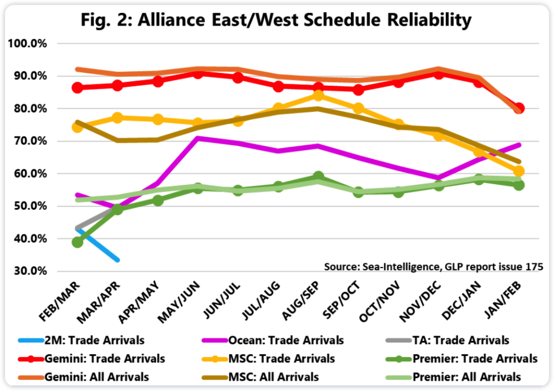 更值得关注的,是行业内部的“分化”被迅速放大。在全球前13大承运人中,德国的赫伯罗特(Hapag-Lloyd)以67.4%的准点率领跑,而万海仅为47.9%,两者相差近20个百分点。更刺眼的事实是,在1—2月的窗口里,只有三家航运公司较1月实现了环比改善。联盟层面,“双子合作”(Gemini Cooperation)在2026年1/2月实现“所有到港”准点率79.1%,全球最大班轮公司MSC为63.7%,Premier Alliance联盟为58.4%,而海洋联盟为68.9%。Sea-Intelligence同时开始对“所有到港”和“贸易到港”分别披露,以便在新旧联盟并行期下提供更可比的衡量口径,这一方法学的微调,恰恰折射出行业结构重组对运营稳定性的实质影响。