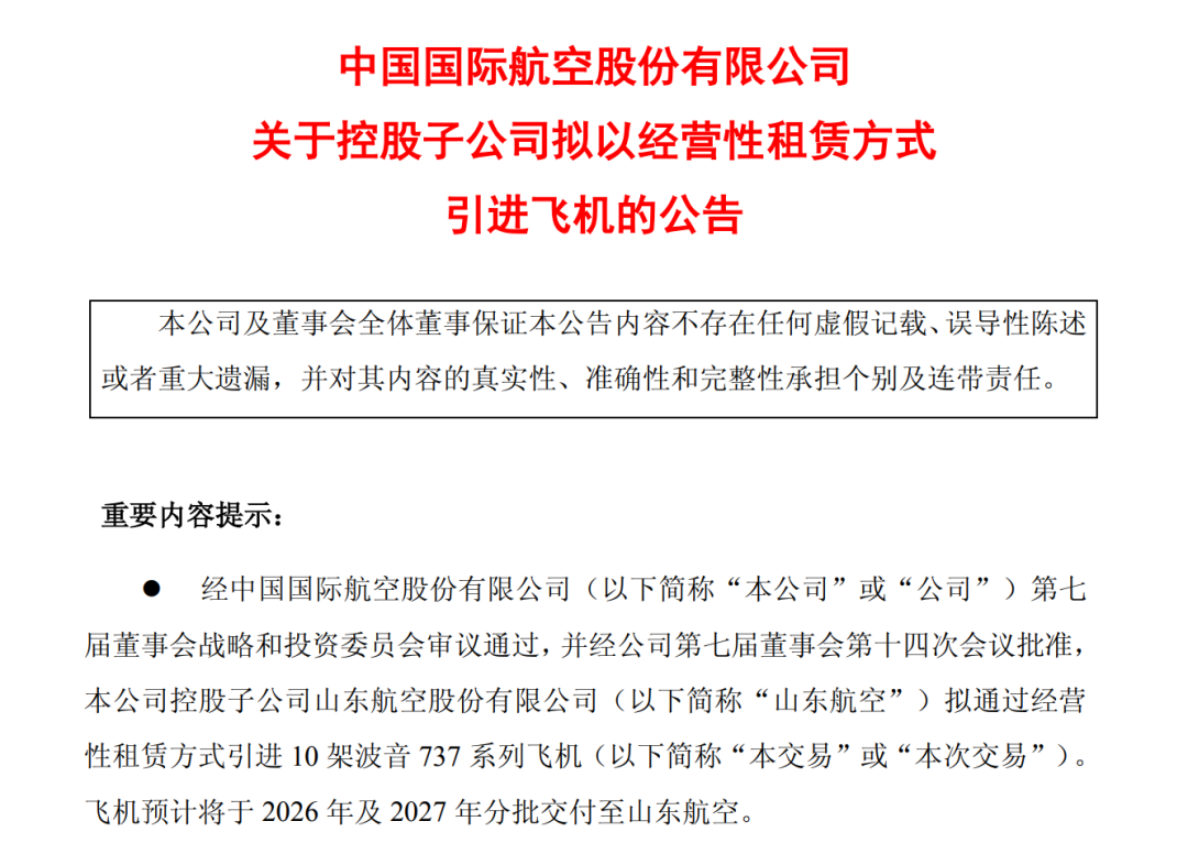 航空旅(FlightGlobal)消息,国航发布公告,控股子公司山东航空拟通过经营性租赁方式引进10架波音737系列飞机,飞机预计将于2026年及2027年分批交付至山东航空。
