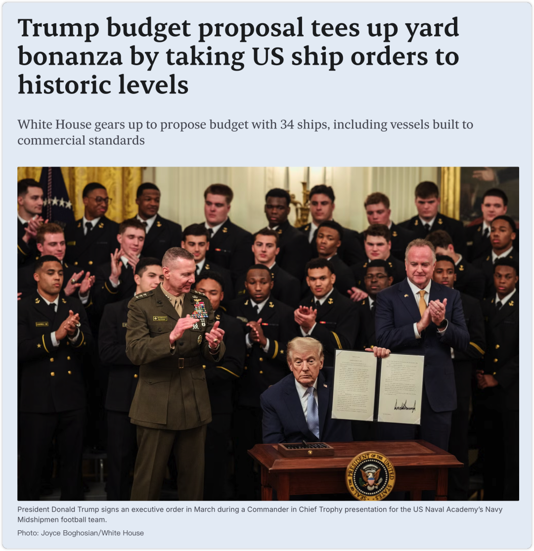 别以为这是临时起意。特朗普从去年3月重返白宫后不到两个月,就宣布成立白宫造船办公室;4月签署《恢复美国海上主导地位》行政令;今年2月又推出《海上行动计划》。如今,预算成了把这些宏伟蓝图变成现实的“杀手锏”。过去15个月,特朗普政府已累计要求建造123艘舰船:本财年35艘海军舰艇+“一大美法案”中的47艘海岸警卫队舰艇。数字背后,是他那句经典名言:“我们曾经造那么多船,现在不怎么造了,但很快我们就会造得又快又好,这将极大提升国家安全!”