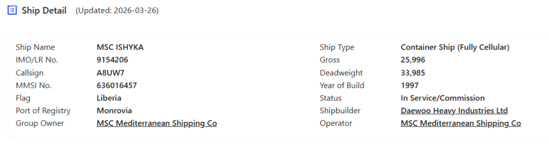 从船舶资料来看,“MSC Ishyka”轮是一艘悬挂利比里亚旗的支线集装箱船,建于1997年,船长约208米,运力约2500标箱,长期服务于MSC中东区域支线航线。该船主要在波斯湾及印度洋周边港口之间执行运输任务。