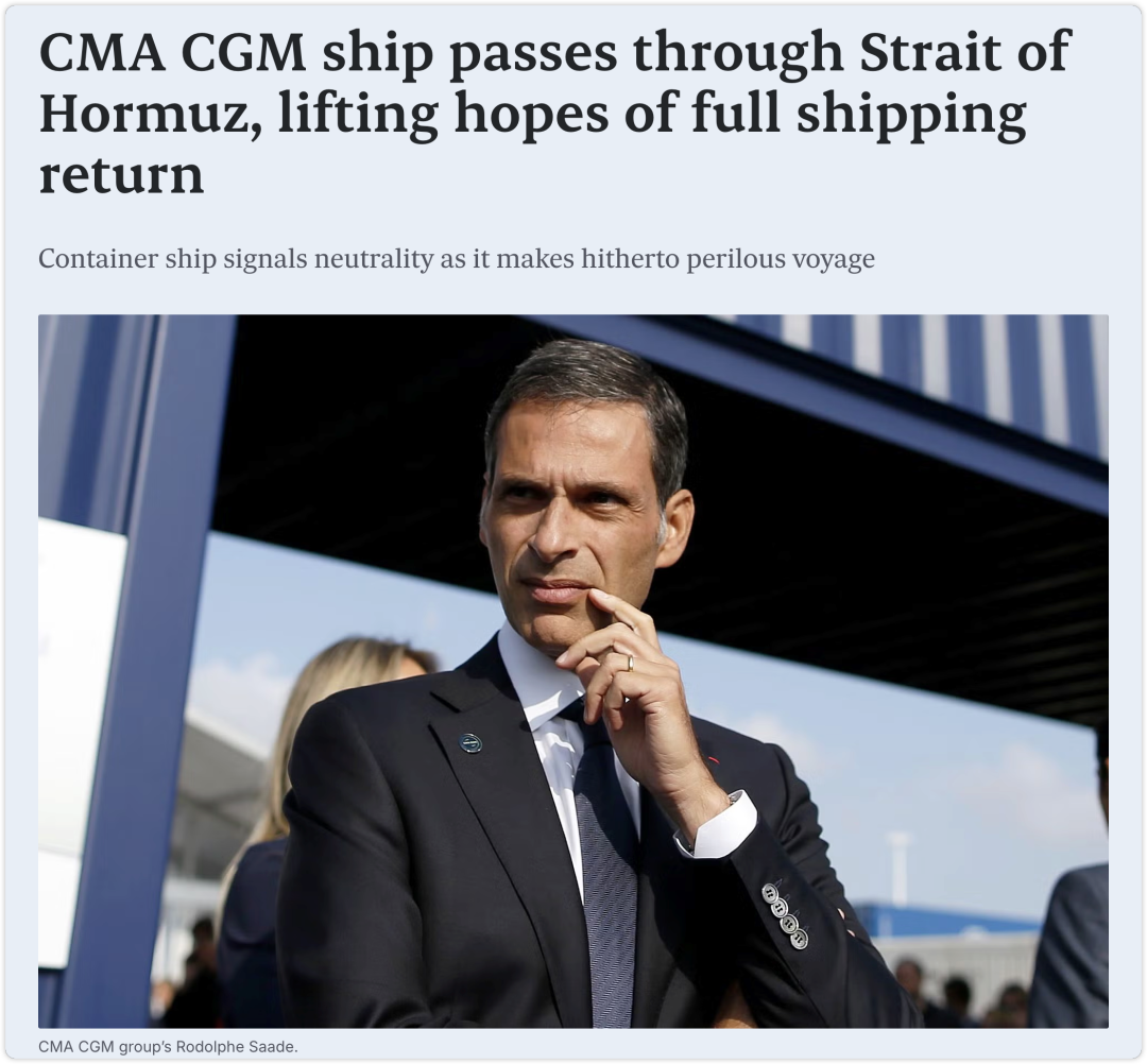 当一艘挂着法国船东旗帜的集装箱船堂堂正正打开AIS,顺利穿越霍尔木兹海峡、驶出中东海湾时,全球航运界长舒了一口气。这不是一次普通的航行,而是冲突阴影下的一次高调突围。它用实际行动宣告:航运不会被地缘政治彻底绑架,贸易的血脉终究要重新流动。