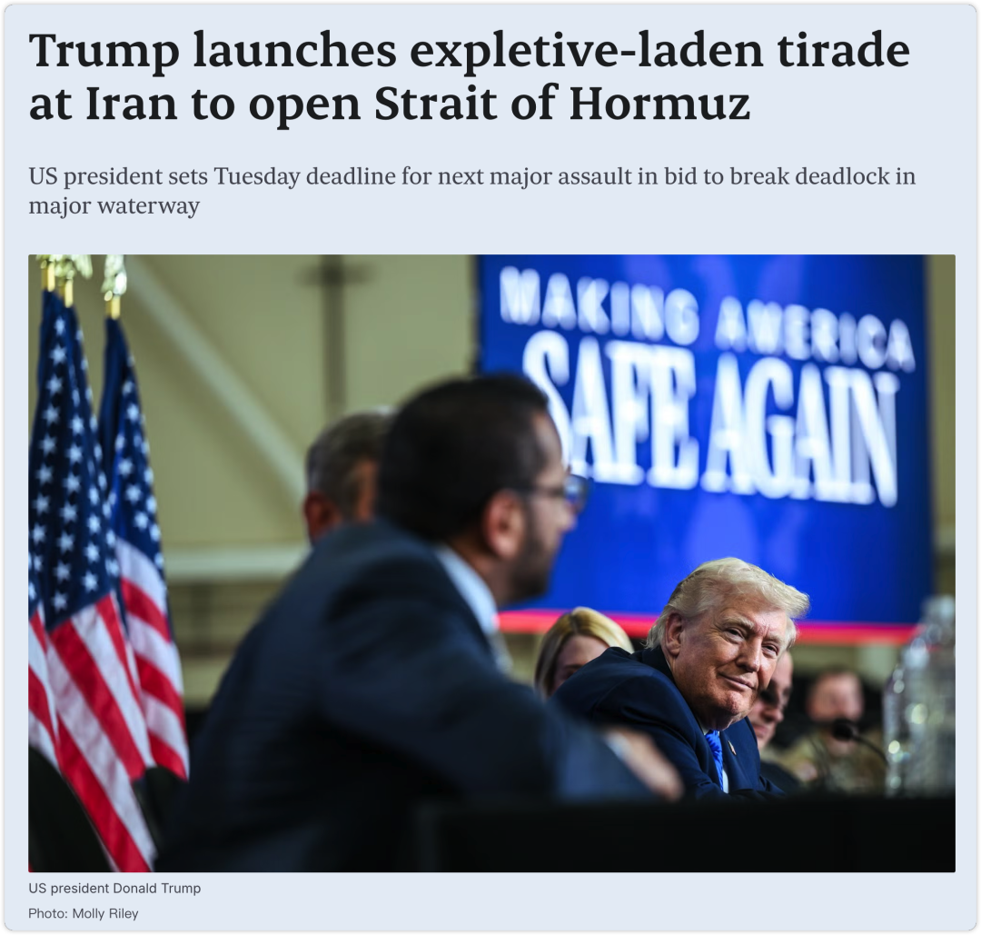 美国总统特朗普周日在Truth Social上发出一篇堪称“外交核弹”的帖文,字里行间充斥着脏话与赤裸裸的战争威胁,把中东能源咽喉——霍尔木兹海峡的僵局,直接推向了全球神经崩溃的边缘。