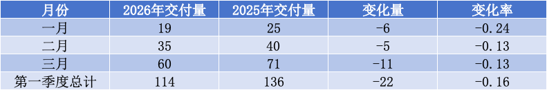 这一表现需结合背景来看:空客2025年第一季度本身已较2024年同期(142架)有所下滑,而2026年开局面临的供应链压力进一步加剧,包括机身面板问题、发动机延误,以及与Pratt & Whitney(普惠)公司在发动机分配上的争议。月度交付情况空客2026年第一季度月度交付分别为:1月19架、2月35架、3月60架。与2025年同期相比,各月均有下滑。