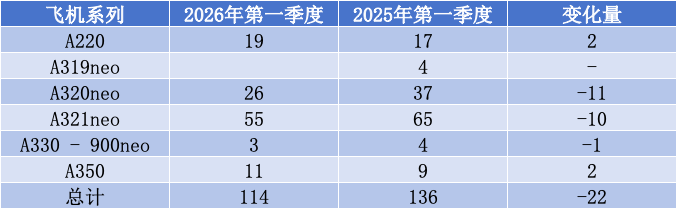 按机型家族拆分,空客在A220和A350系列实现小幅增长,但A320家族交付下滑明显拖累整体表现。A319neo、A320neo和A321neo合计交付81架,较2025年第一季度的106架减少25架,降幅约24%。