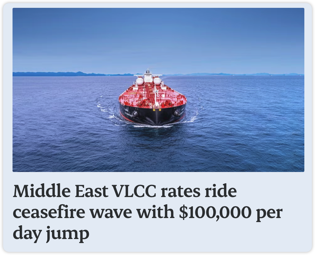 1. 中东VLCC运价乘停火浪潮飙升,日租金激增超10万美元