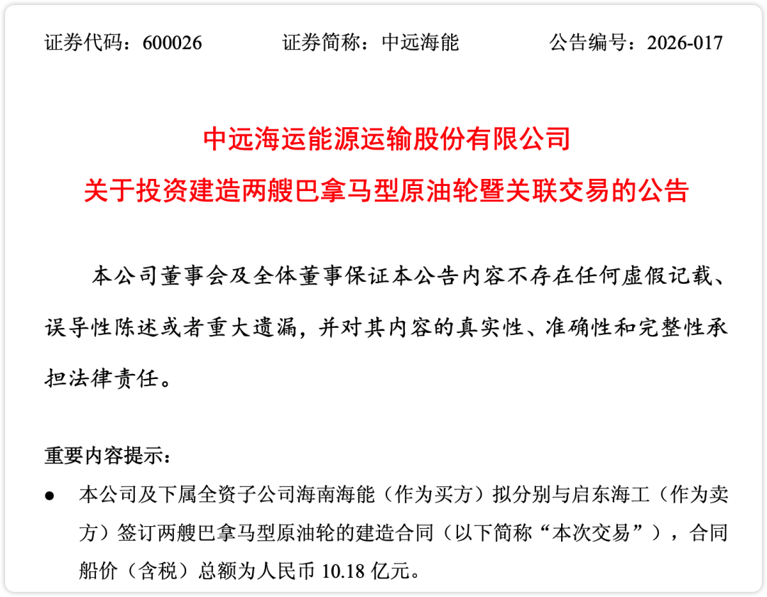 2026年4月15日,中远海能董事会批准投资新造2艘巴拿马型原油轮,总投资约10.43亿元,计划于2028年交付。从单笔规模看,这一订单并不突出;但若将其置于公司近年船队更新的整体脉络中审视,则意义远不止于此。