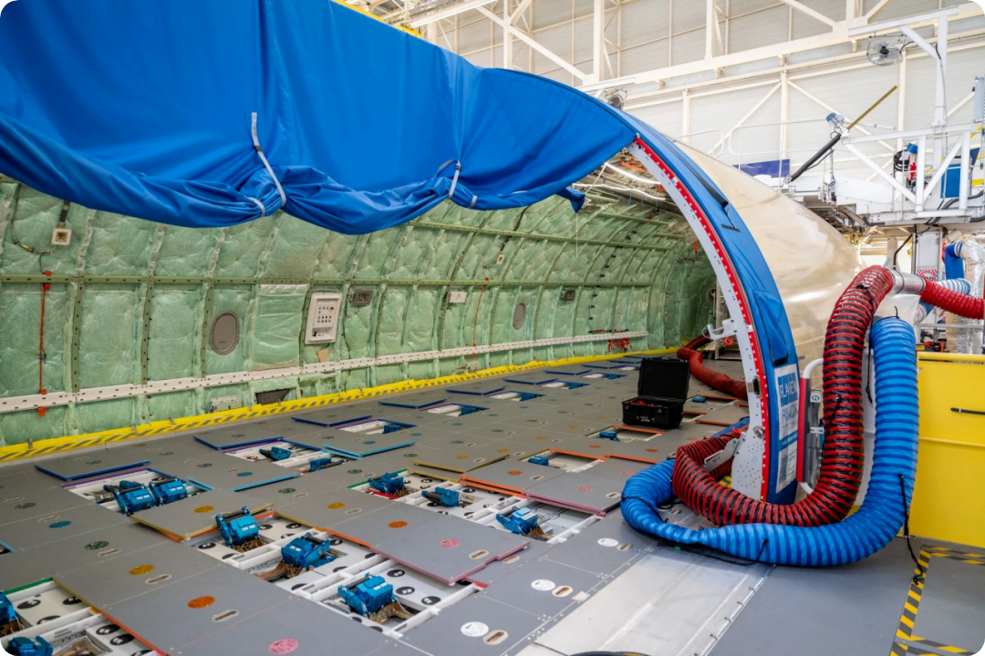 量产测试旨在检查每架特定飞机的系统集成是否符合定义。该流程包括工程团队提出测试要求,总装线地面测试设计部门将其转化为测试程序,供测试技术人员和生产团队执行。在A350客机的约200项系列地面测试指令(GTI)中,多达40%是为A350F专门创建或修改的。全新的量产测试一个示例是主货舱门循环测试:该测试需要多次手动和电动开关货舱门,以检查系统、传感器和报警器在总装周期内的表现。另一个例子是前文中提到的货物装卸系统(CLS)创新型自动化线路自检。在量产中,CLS还将使用重达500公斤的各种集装箱(ULD)进行功能检查。为了配合量产的地面测试,一项独立的“开发与取证测试”并行活动正在两架飞行测试飞机(MSN700和MSN701)上进行。这些是单次性能测试,用于获得欧洲航空安全局(EASA)等机构的验证和确认(Validation and Verification, V&V)。A350F共有55项此类特定测试,称为“地面测试要求”,由总装线地面测试设计团队负责规划和准备,并与工程设计办公室联合执行。一个值得注意的地面测试示例是最大载荷测试:该测试仅进行一次,需要装载111吨的最大有效载荷(相当于约18头大象的重量),以确保系统逻辑和功能正常,特别是主货舱门的运行。增压开发测试是对量产标准增压测试的补充。对于这项一次性测试,飞行测试飞机将加装额外的仪器,包括摄像头、位移传感器和主货舱门上的麦克风,以在货舱压力循环期间严密监控货舱门。