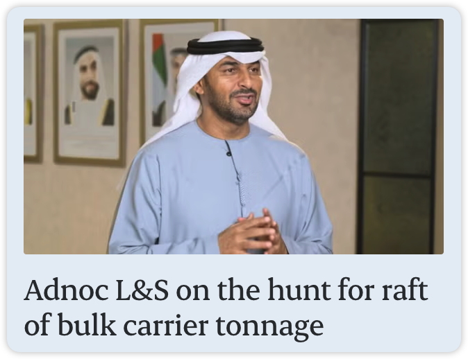 Adnoc L&S早已深耕干散货领域,目前运营3艘 handysize、4艘2011年built supramax 和8艘 ultramax,主要承运母公司Adnoc集团天然气生产副产物硫磺,同时外贸石油焦、化肥、粮食等货物,航线辐射中东以外区域。去年CEO Abdulkareem Al Masabi公开表示,公司拥有超过30亿美元资本支出能力,可通过增船、并购、合资等方式强化市场份额。这次询价,正是其“扩张型”战略的最新注脚——在油气主业基础上,垂直整合干散物流链条,锁定稳定现金流。